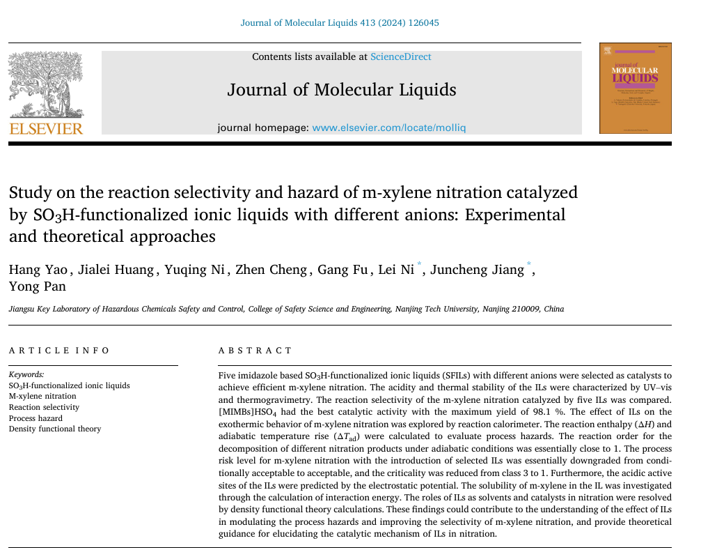 南京工业大学倪磊教授团队在 Journal of Molecular Liquids 期刊发了表题为 Study on the reaction selectivity and hazard of m-xylene nitration catalyzed by SO3H-functionalized ionic liquids with different anions: Experimental and theoretical approaches论文,该成果由国家自然科学基金委员会(编号21927815、52334006、52274209)和江苏省“333”项目支持。